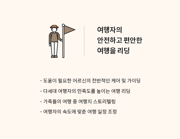 따시리 반장은 여행 중 어르신과 가족의 안전을 최우선으로 하여, 다세대가 만족스럽고 쾌적한 여행이 즐길 수 있도록 돕는 케어 가이드입니다. 따시리 여행의 중심적인 역할을 하는 만큼 철저한 신분 검증을 거쳐 까다로운 교육을 이수하신 분만이 따시리 반장이 됩니다.
